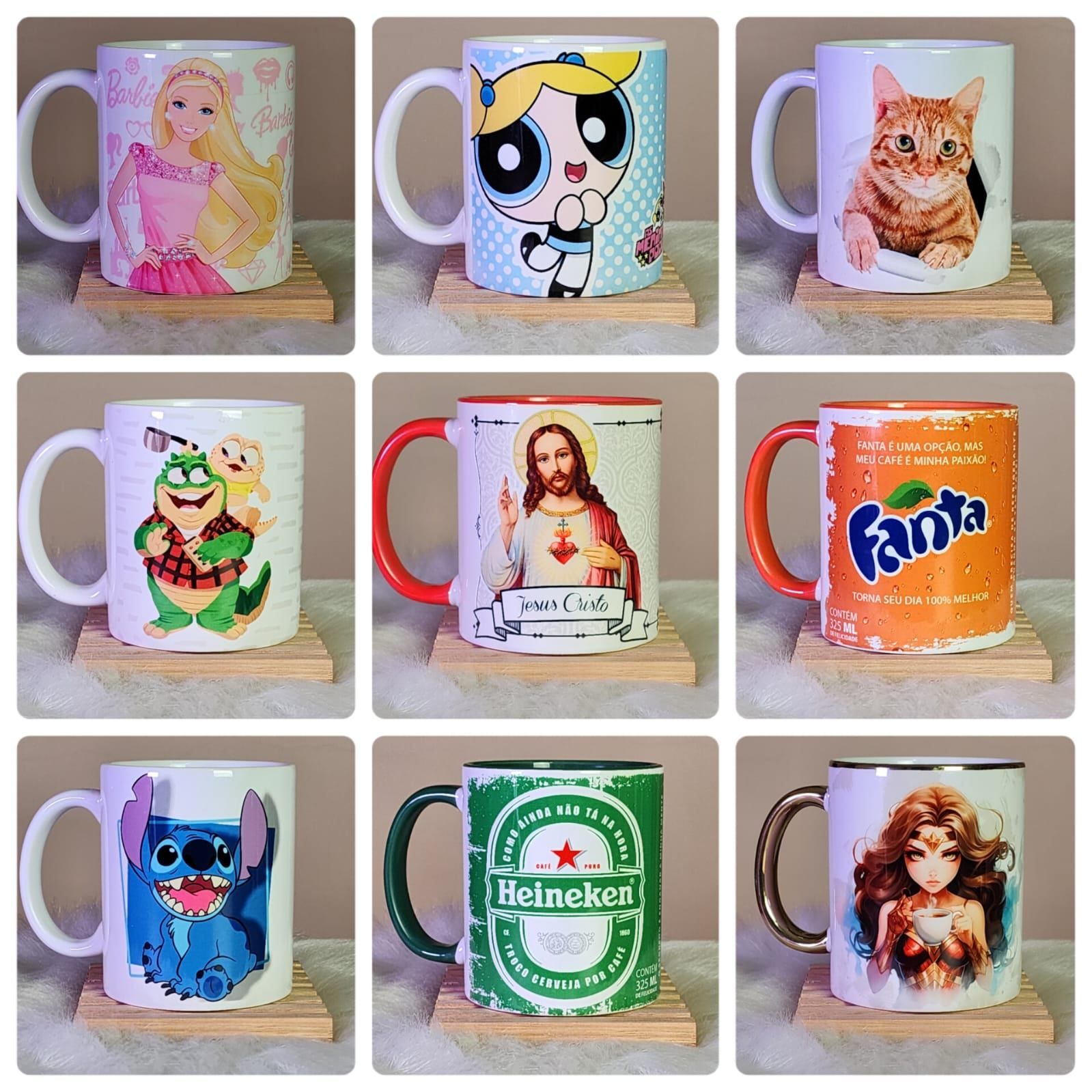 Aprenda a produzir 12 tipos de produtos diferentes: caneca de cerâmica branca, preta, colorida, polímero (plástico), alumínio, vidro, cromada, mágica, glitter, chopp, xícaras e squeezes.